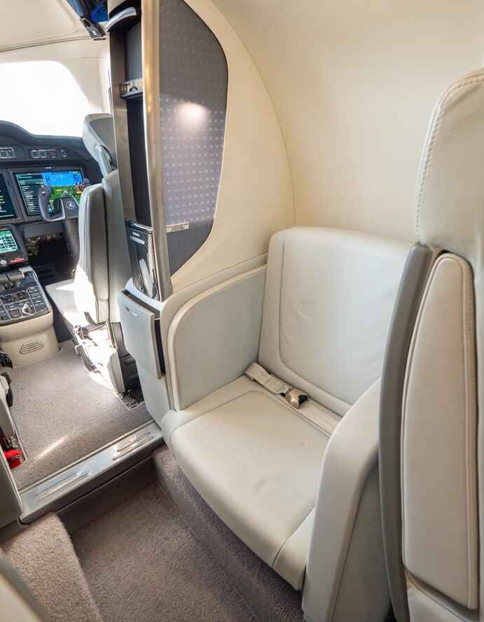 2022 HondaJet Elite S cabin jump seat located behind the cockpit, featuring integrated storage, premium leather upholstery, and a compact forward cabin layout.