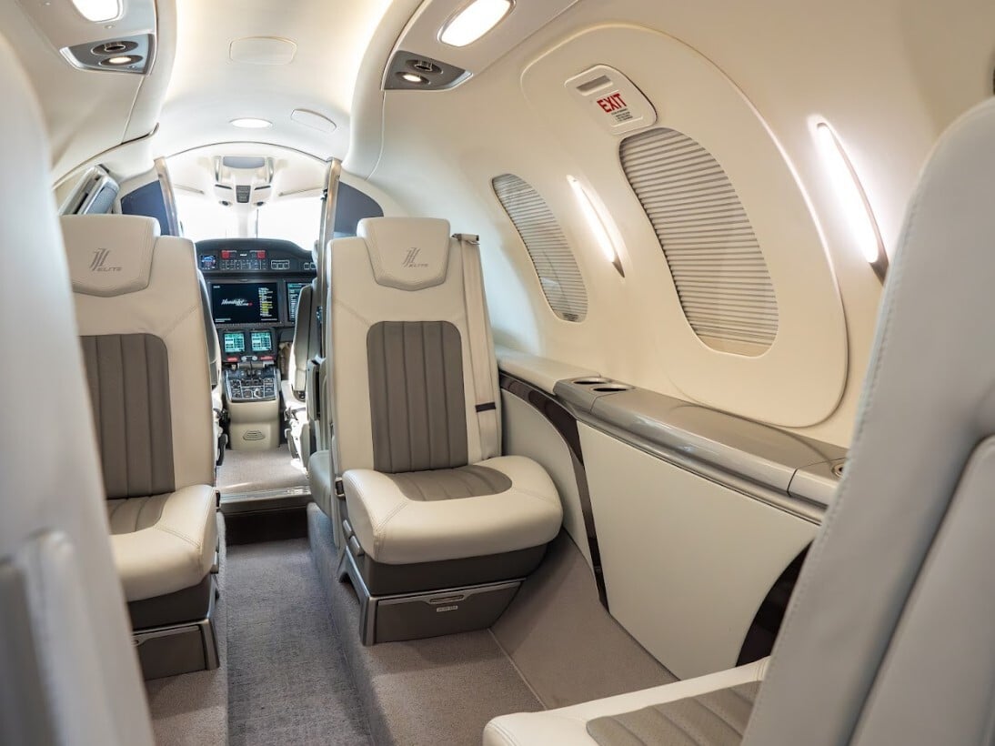 2022 HondaJet Elite S cockpit featuring a modern dual-pilot flight deck, advanced glass avionics displays, ergonomic controls, and panoramic forward visibility.